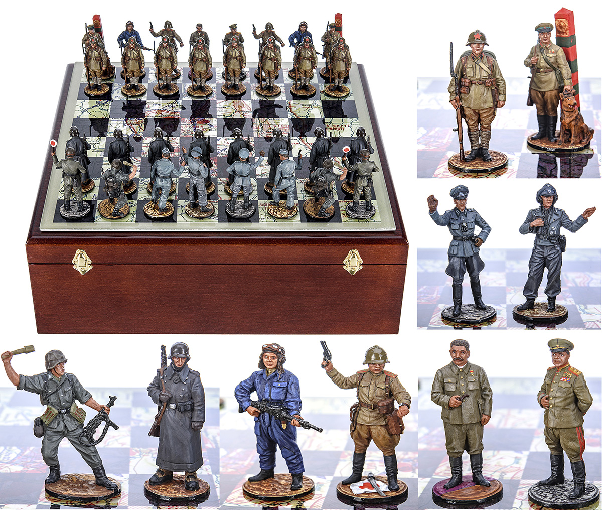 Шахматы "Великая Отечественная война. Вторая мировая война" Материал фигур - олово. Размер доски 32х32 см. Высота короля - 7 см.