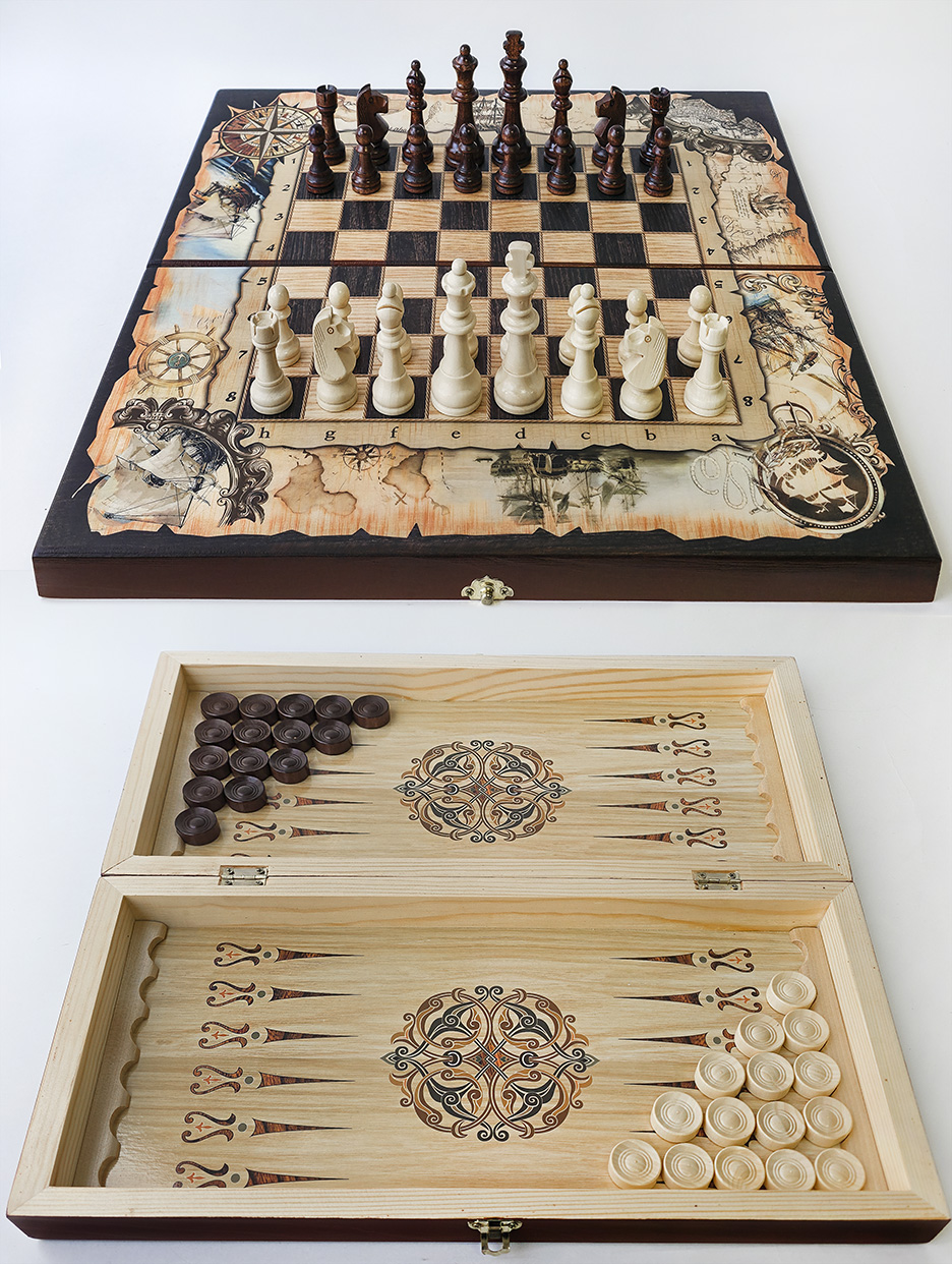 Шахматы + нарды деревянные "Морские сражения". Складная доска. Размер доски 50*50см. высота -короля 10 см