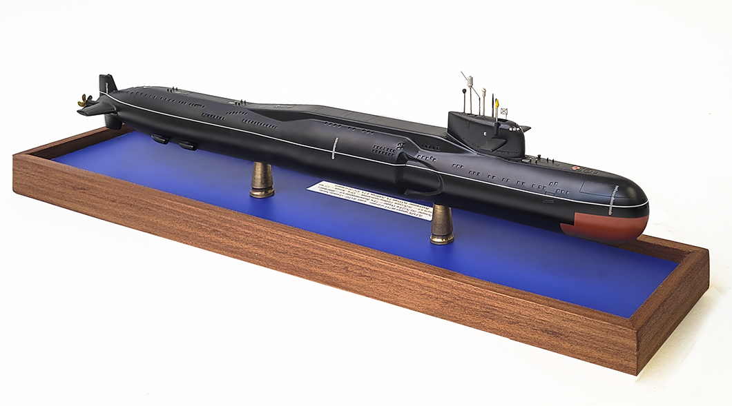 Модель подводной лодки проект 941 Акула. Введеные в строй АПЛ: "Дмитрий Донской", "Симбирск", ТК-13, "Архангельск", ТК-202, "Северсталь". Высокая степень детализации. В защитном футляре.