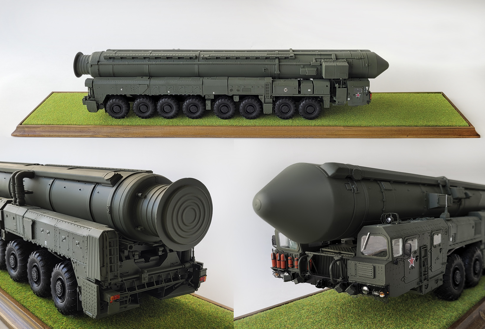 Модель ракетный комплекс стратегического назначения РТ-2ПМ "Тополь" . Длина модели - 33 см. Модель укомплектована футляром из оргстекла.